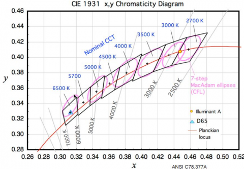 ANSI(美國(guó)國(guó)家標(biāo)準(zhǔn)組織)C78-377A 號(hào)文件使用四步MacAdam橢圓定義的方法作為CFL(小型熒光燈)和鹵素?zé)糁圃斓臉?biāo)準(zhǔn)。每一步代表了一片面積,該面積區(qū)域里的任何一個(gè)點(diǎn)都是離中心點(diǎn)一個(gè)標(biāo)準(zhǔn)差。